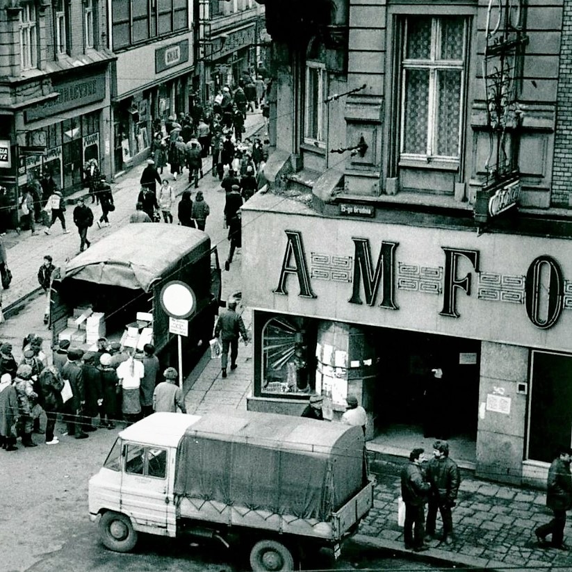 Św. Jana (St. John's) Street is one of the oldest in Katowice. Its buildings are mostly well-preserved eclectic townhouses from the turn of the 19th and 20th centuries. It owes its name to the figure of a saint visible near the intersection with Staromiejska Street, placed here in 1816 (the current sculpture is a replica of it). In the 1960s, the AMFORA drugstore opened its doors on the ground floor of the corner tenement house. At the time, it was one of the best-stocked stores of its kind, successfully competing with nearby department stores like Zenit, PDT, and Skarbek. The Amfora drugstore operated almost until the end of the 20th century. Currently, there are completely different commercial premises in this location. However, it's pleasing that several new, successful neon advertisements have been created in the area recently.