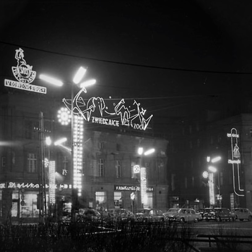 In the western, now non-existent, frontage of the Katowice Market Square, there was once a low tenement house housing Borinski's colonial store, and later Delikatesy. A neon sign for the Chorzów Zoo flickered on the roof of the tenement building, inviting: "VISIT THE ZOO." We can clearly recognise the shapes of a monkey, an elephant, a giraffe, a camel, and a kangaroo. Next to it, on the corner part of the roof, there was a neon sign advertising the Social Fund for the Reconstruction of the Capital, where the Warsaw mermaid with a trowel in her hand was calling for donations: "SFOS – this is your contribution to the reconstruction of the capital.